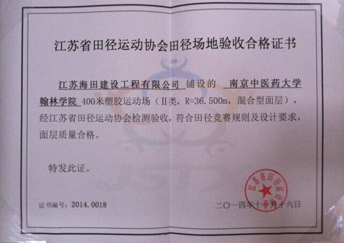熱烈祝賀我公司承建的翰林學(xué)院400米塑膠運動(dòng)場(chǎng)被評為“江蘇省合格田徑場(chǎng)地(Ⅱ)”